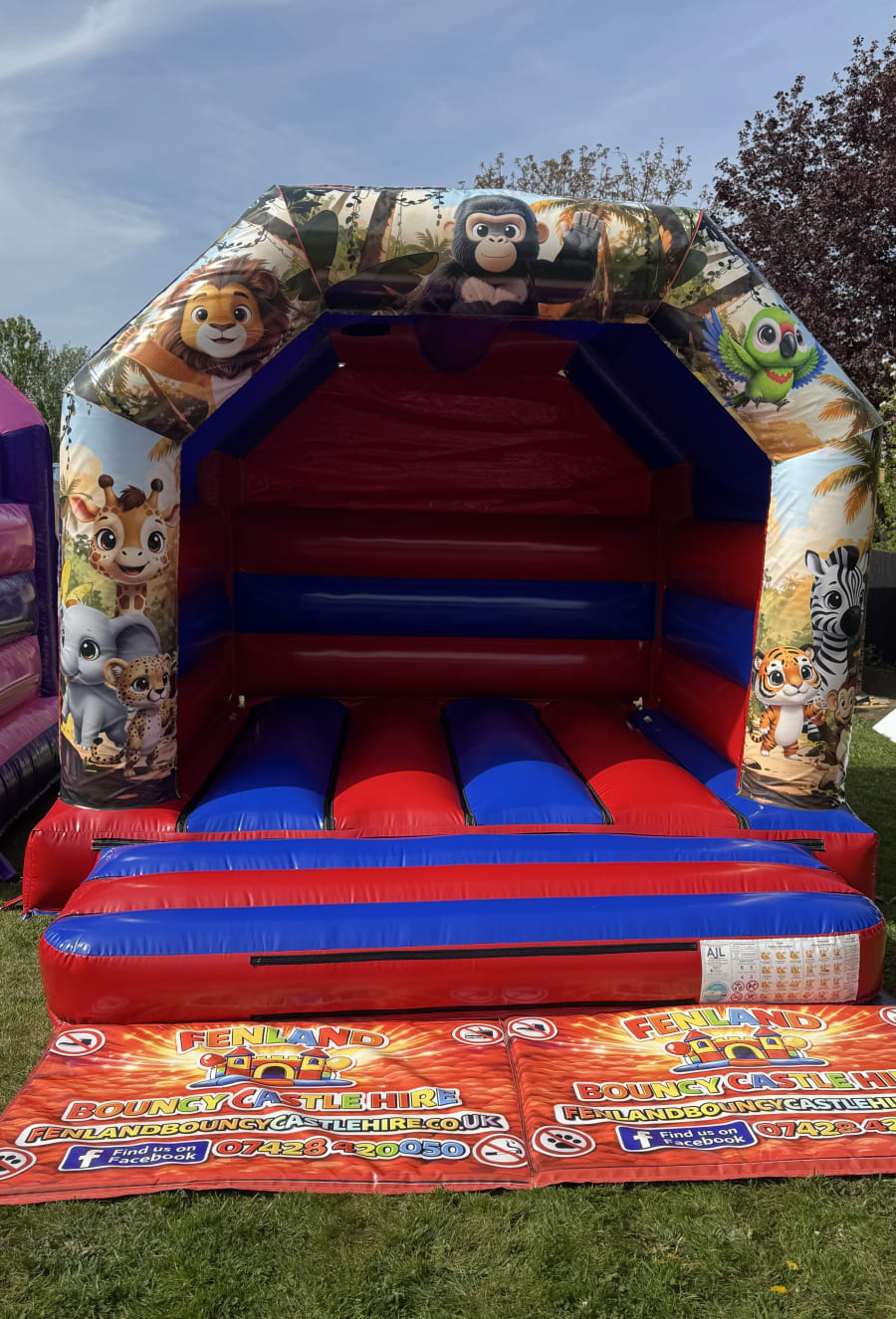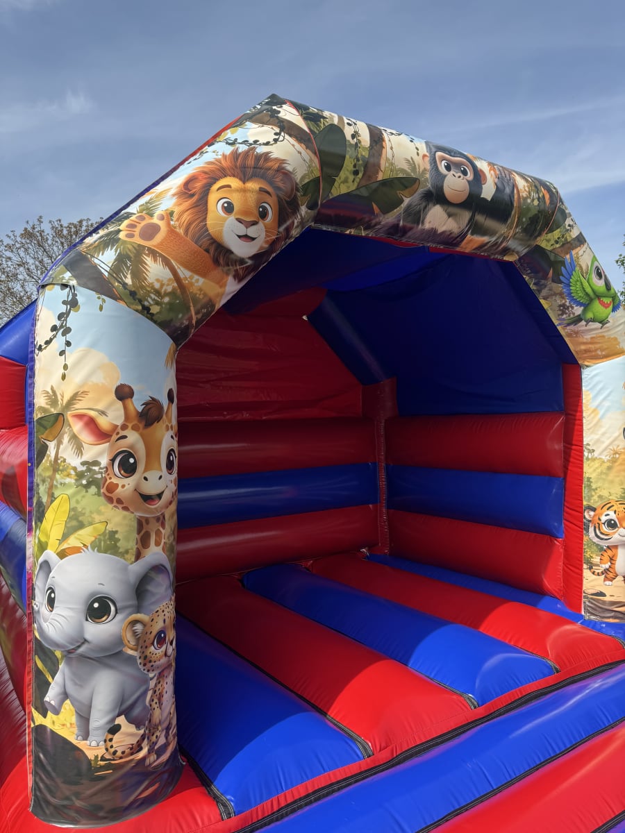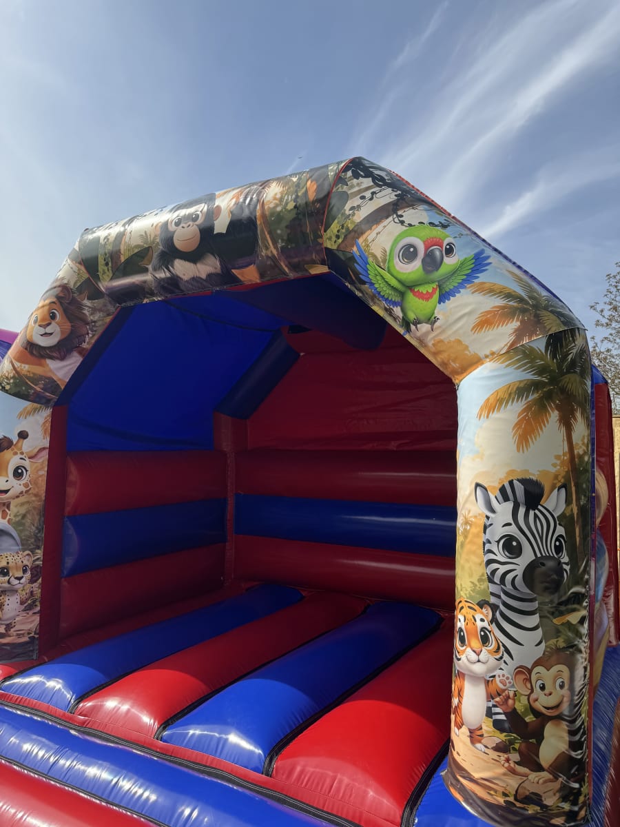 Our Jungle Velcro artwork on the Blue & Red 12ft x 12ft Bouncy Castle is a bright, fun option that really stands out at any party The bold red and blue base gives it a lively, energetic feel, while the jungle artwork adds that extra excitement children love.